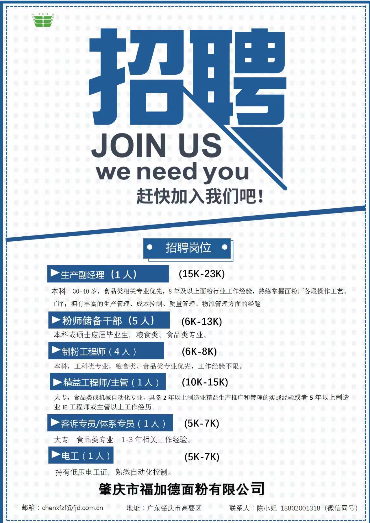 肇庆市福加德面粉有限公司一、招聘岗位:1、粉师储备干部 5人 (6K-13K)本科或硕土应届毕业生,粮食类、食品类专业。2、制粉工程师 4人 (6K-8K)本科,工科类专业,粮食类、食品类专业优先,工作经验不限。二、联系方式:邮箱: [email protected]地址:广东肇庆市高要区联系人:陈小姐18802001318 (微信同号)